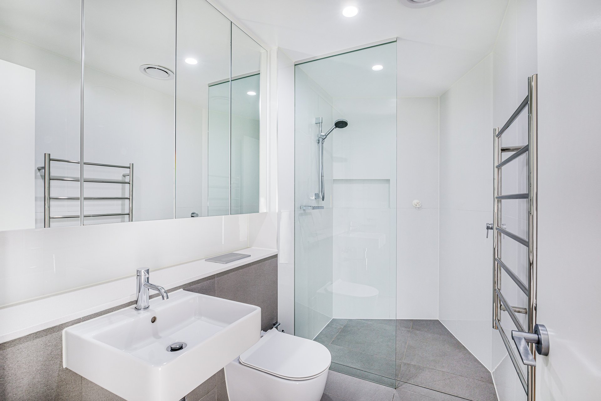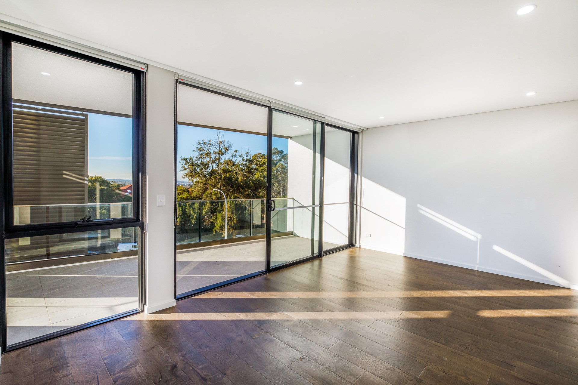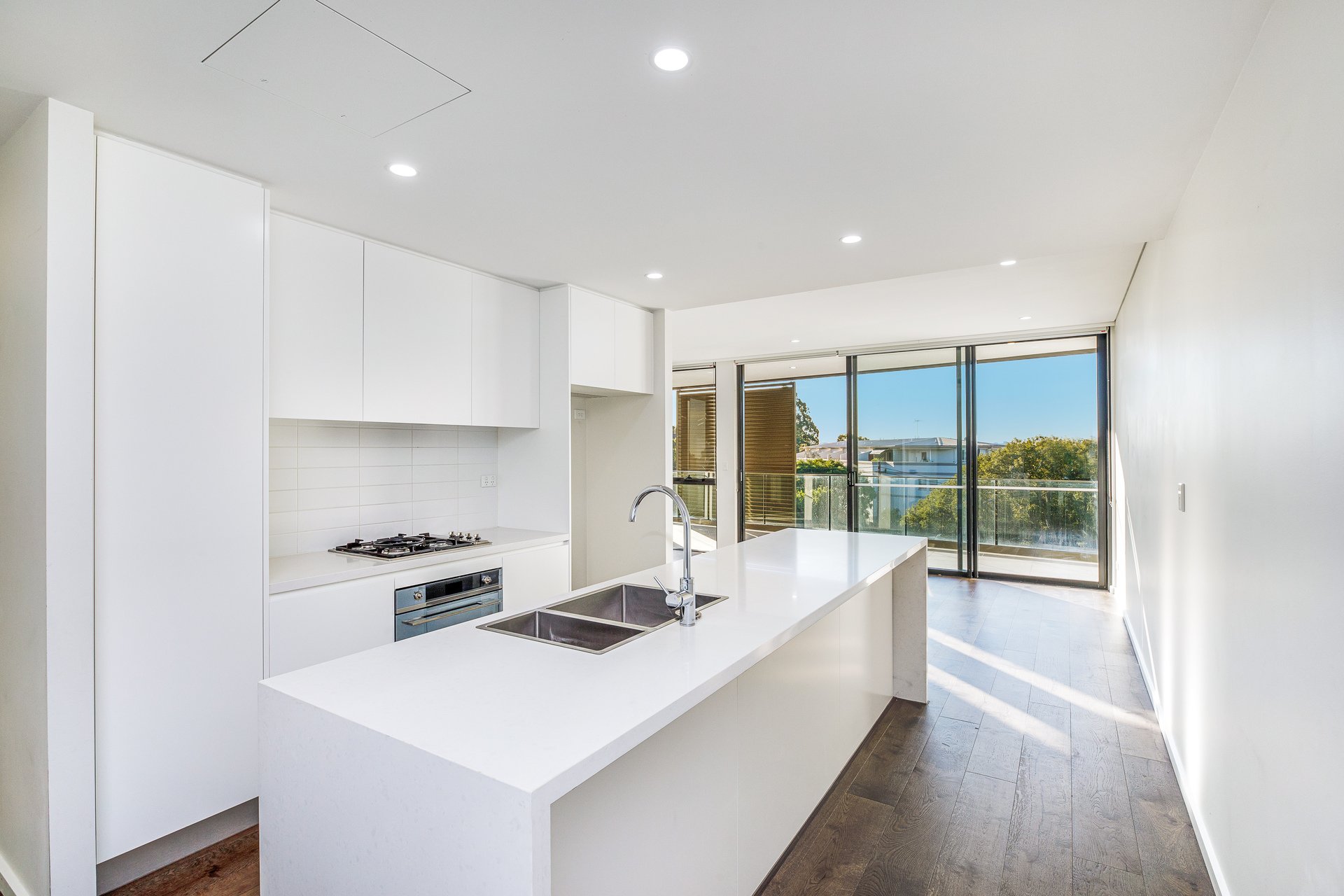 A palette of whites and modern neutrals complements oak whitewash timber flooring.