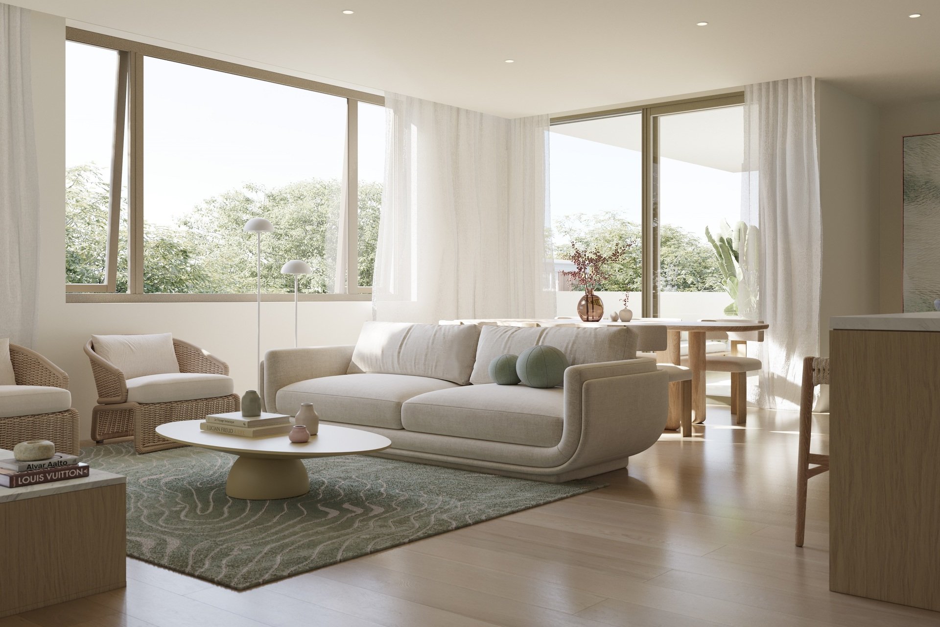 • ‐ Luxurious Finishes: Light oak engineered timber flooring flows into living areas, transitioning to porcelain tiles in bathrooms and plush wool carpet in the bedrooms