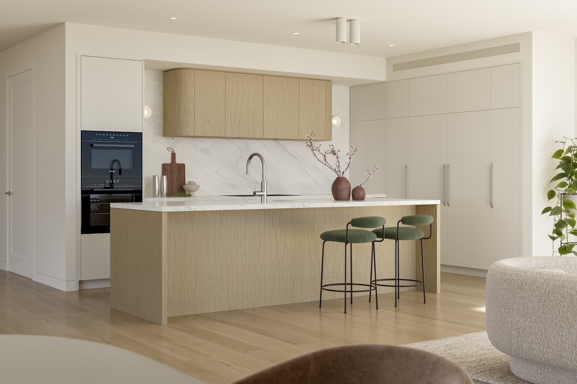 • ‐ Gourmet Kitchens: State-of-the-art kitchens boast a bespoke timber and stone island, high-end Miele appliances including an integrated dishwasher, fridge & freezer