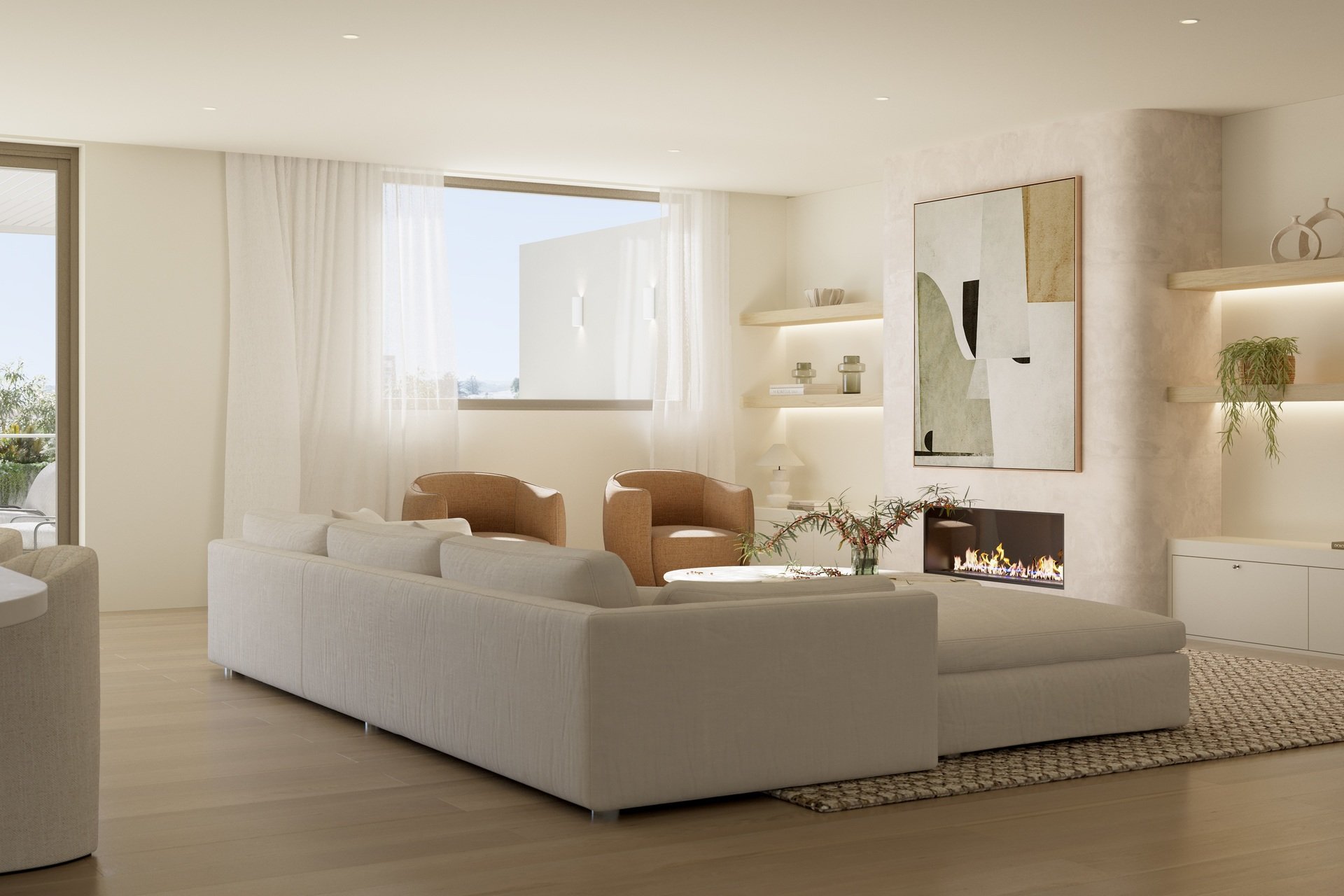 • ‐ Timeless Design: Elegant curves and a cohesive colour palette create an inviting aesthetic, featuring a textural accent wall with a built-in linear gas fireplace