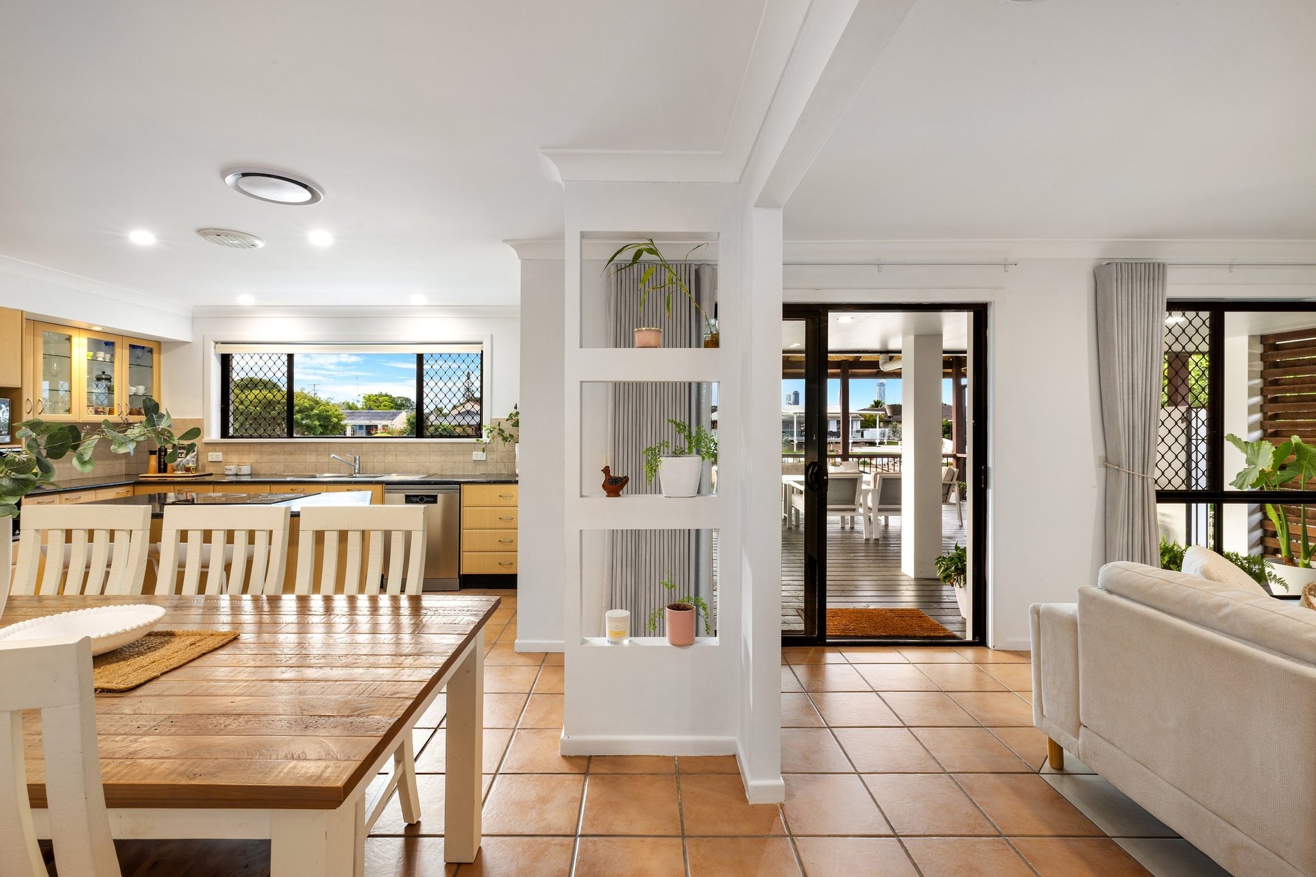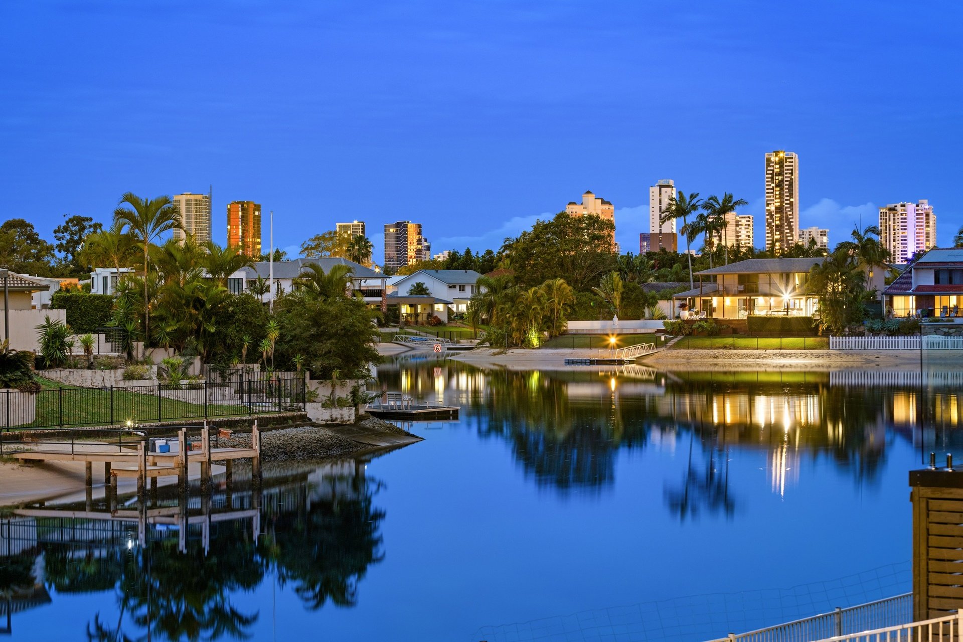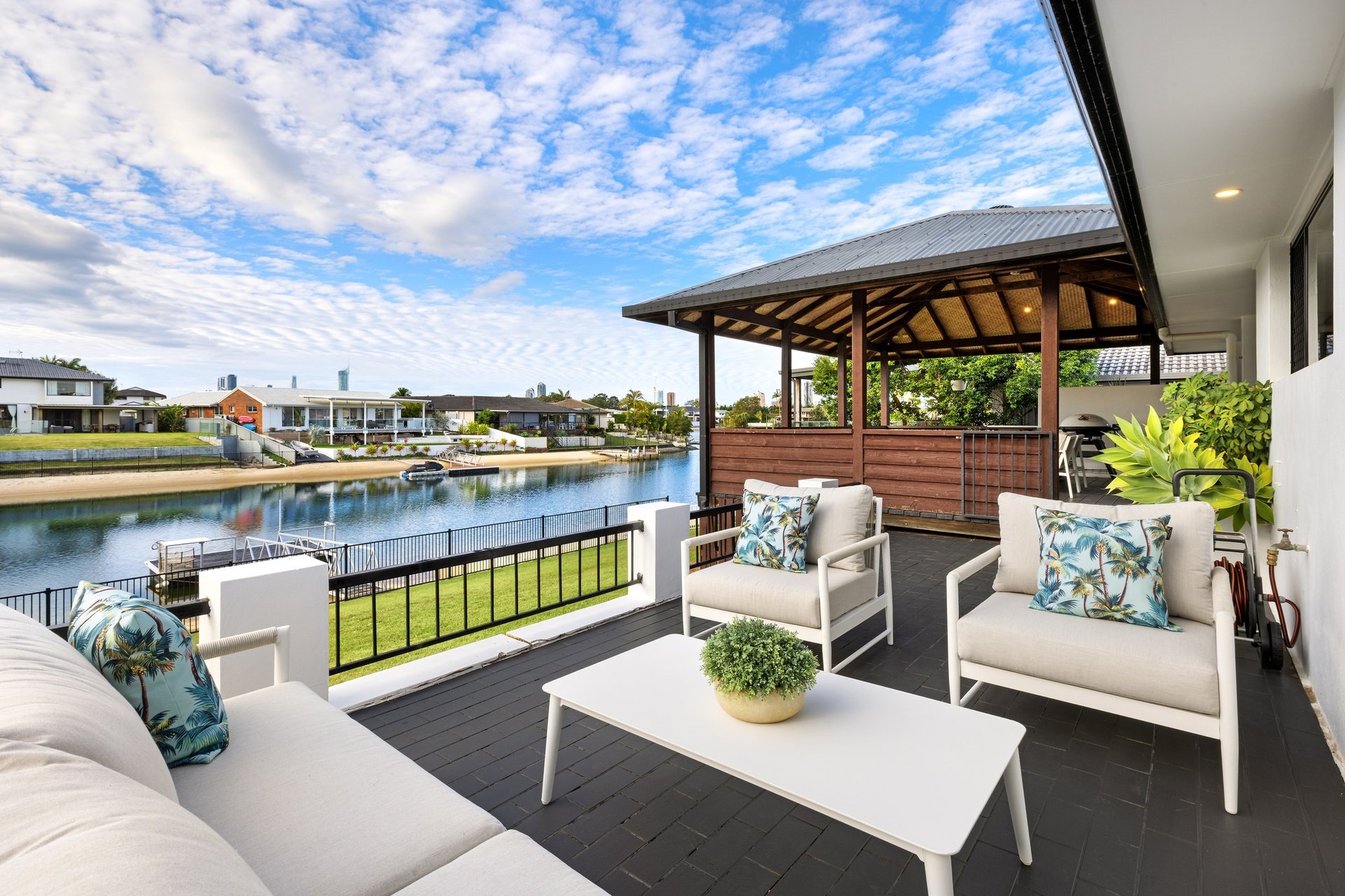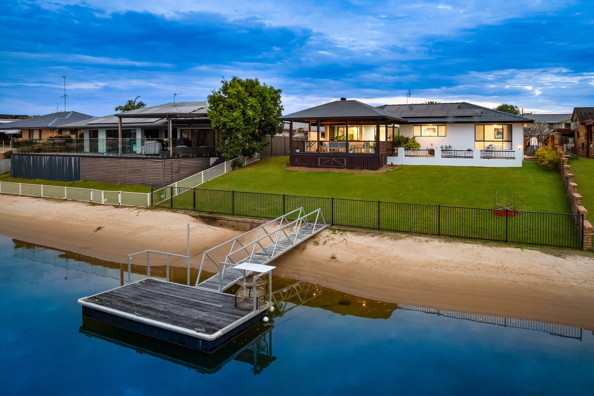 Commanding a prized north-to-water position, this beautifully presented brick home captures the essence of relaxed waterfront living. Set on an 821m2 block with an impressive 20.3m sandy beach frontage, it sparkles against skyline views that stretch from Broadbeach to Surfers Paradise. The interiors are equally inviting. Fresh and light-filled, with new window dressings fitted, enjoy an open plan kitchen, dining and living zone which connects to an expansive entertaining pavilion. Host guests here, or on the open-air terrace as you savour tranquil water vistas, plus take advantage of a pontoon, a charming second lounge, four generously sized bedrooms and two bathrooms (including a master with ensuite). Additionally, comfort meets efficiency courtesy of ducted reverse cycle air-conditioning, a 10kW solar system, and new hot water system, with convenience also assured. Close to parks, public transport, health services, eateries and more, it's also just 3.5km from golden beaches and under 3km to Pacific Fair and The Star.