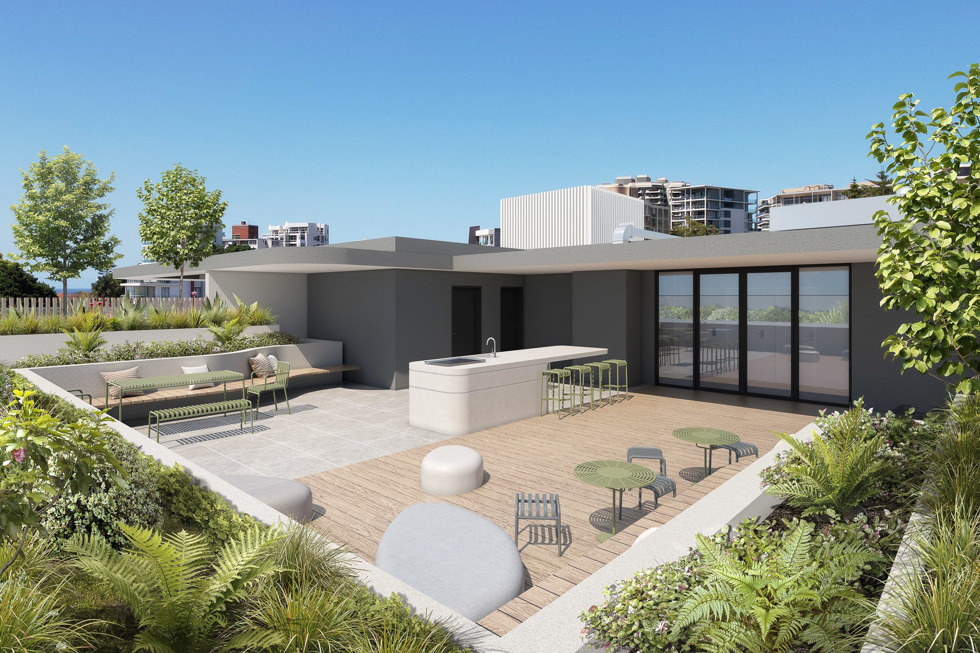 Crowning the building, the rooftop terrace offers panoramic ocean views in every direction - a truly spectacular space by acclaimed landscape architect DSB. Designed for both relaxation and entertaining, it features a built-in BBQ, integrated seating framed by lush garden beds, and stylish alfresco zones for gathering with friends. Here, you can share a meal, sip a glass of wine, and watch the sun sink into the horizon - all without leaving home.