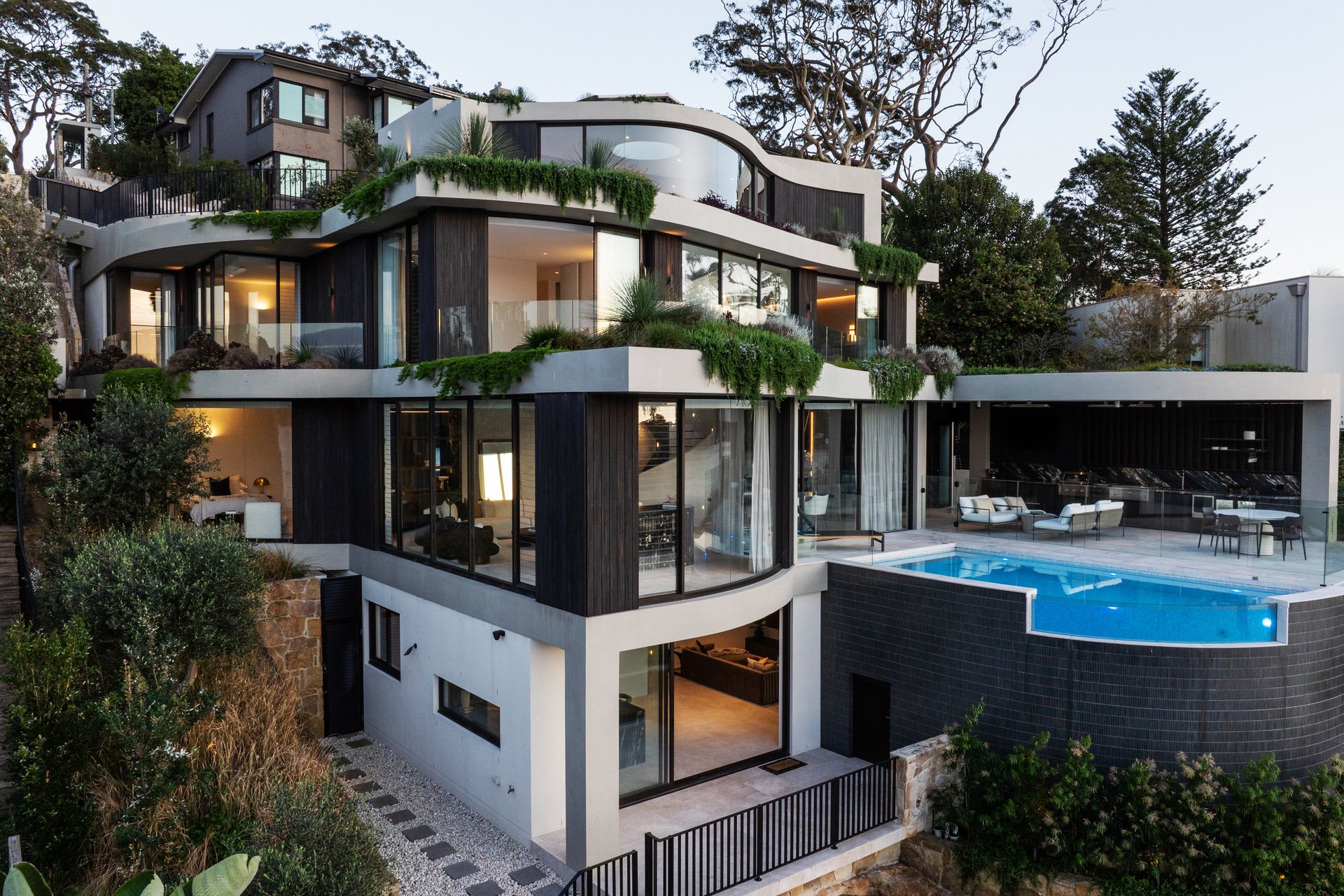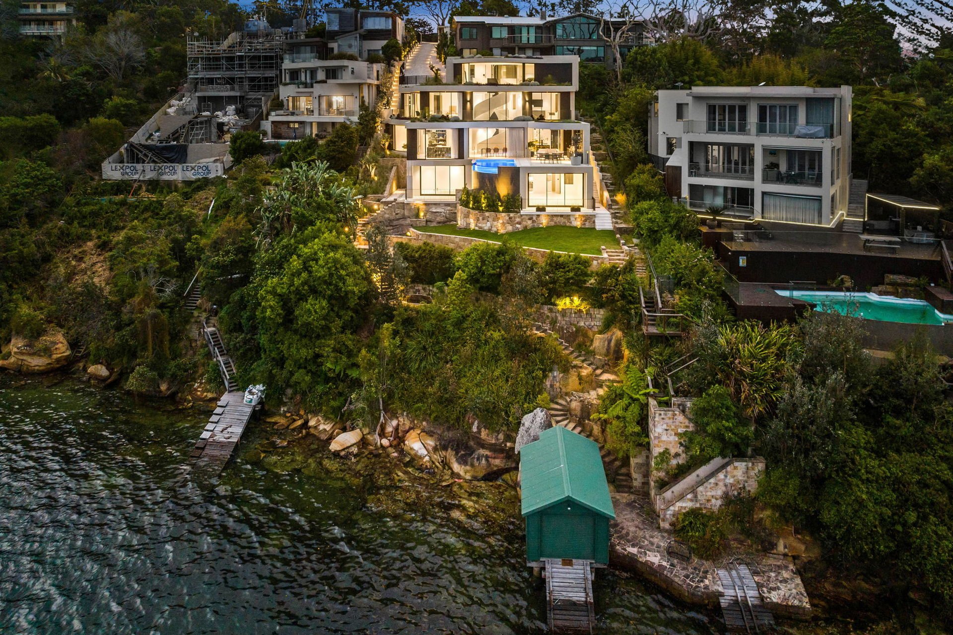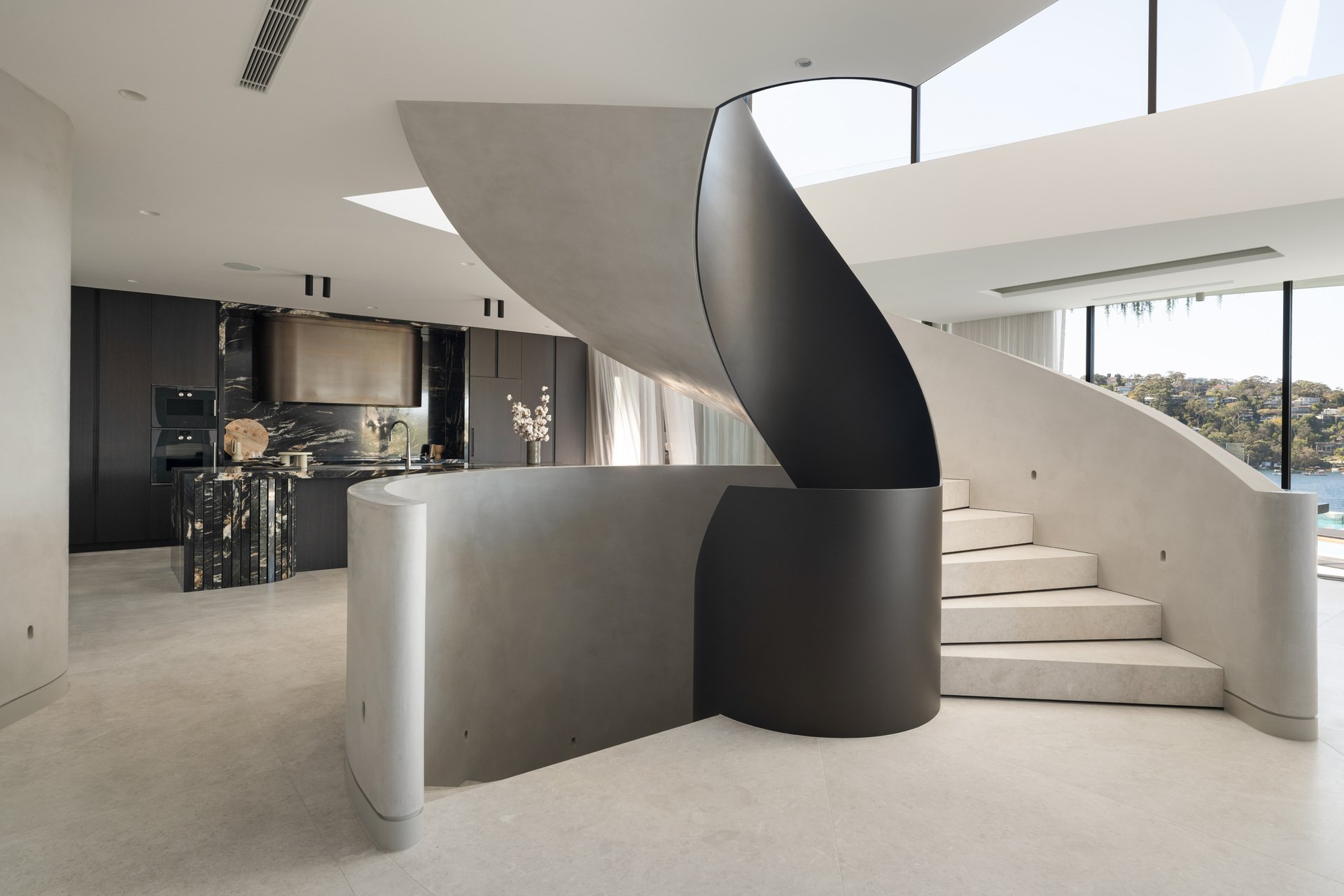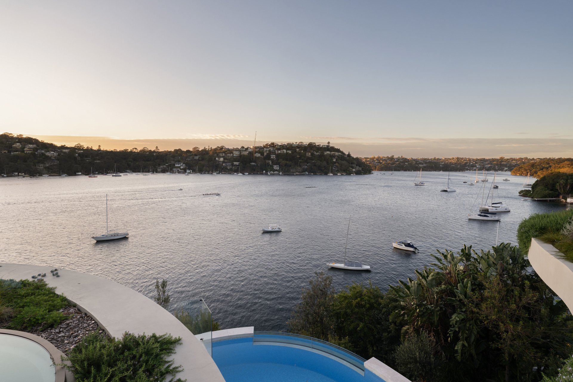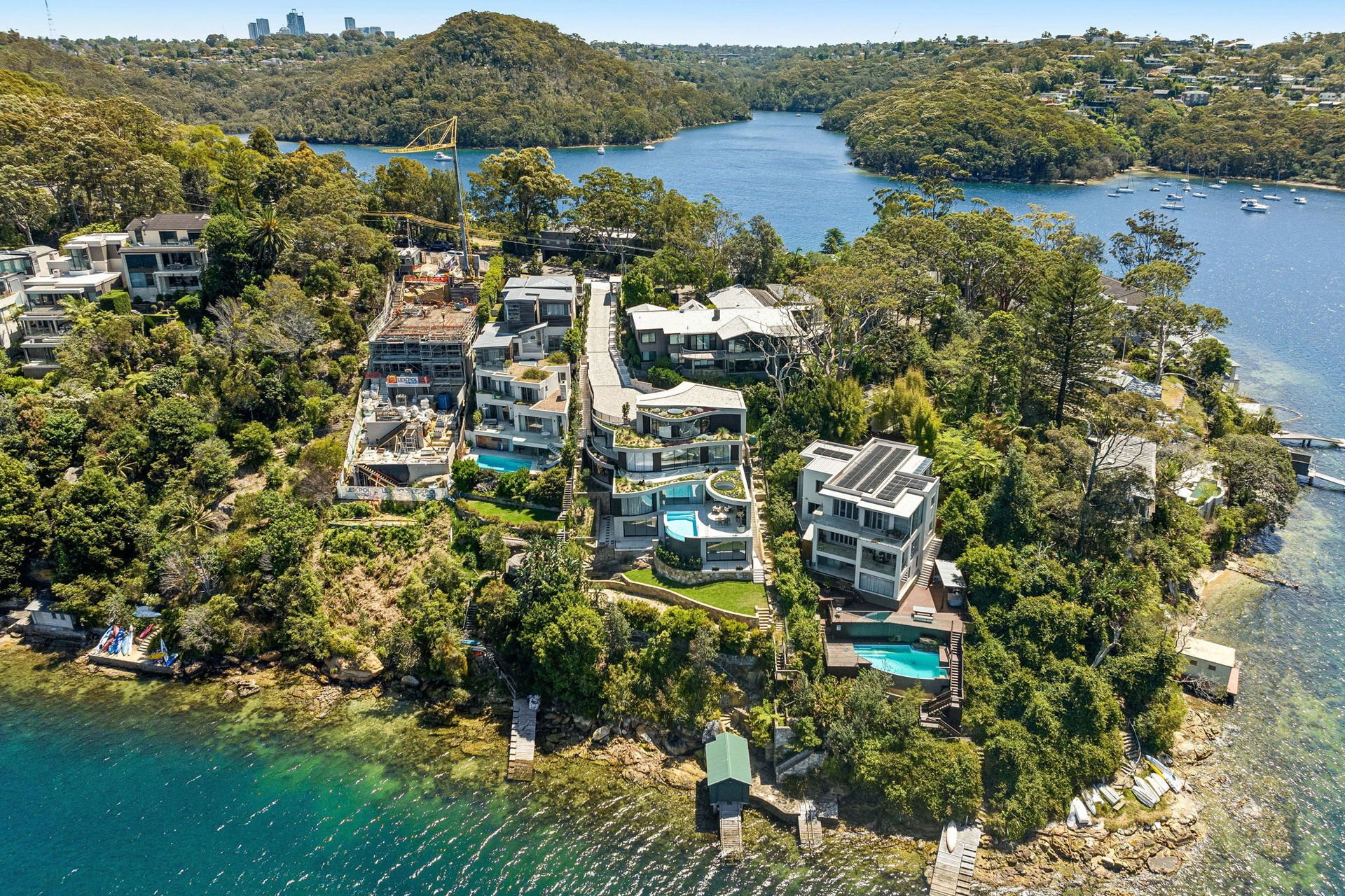 This brand-new waterfront home by Alchemy Architecture blends luxury and seclusion. Expansive glass panels capture breathtaking harbour views, while curved accents and sculptural elements add a unique touch. The double brick and concrete structure reflects Castlecrag's natural beauty, with a striking helical staircase as its centrepiece. Designed for lavish entertaining, the home features spacious living and dining areas, a terrace with a skylight, and an alfresco kitchen. The mosaic pool seamlessly merges with the harbour backdrop. The marble kitchen includes a butler's pantry and opens to a primary bedroom wing with an ensuite and circular tub, flowing onto the upper balcony. An internal lift, boatshed, entertainment room, gym with custom sauna, and a deluxe office/sixth bedroom complete the home. Situated on a tranquil block, it's close to city buses, top schools, and Castlecrag Village.