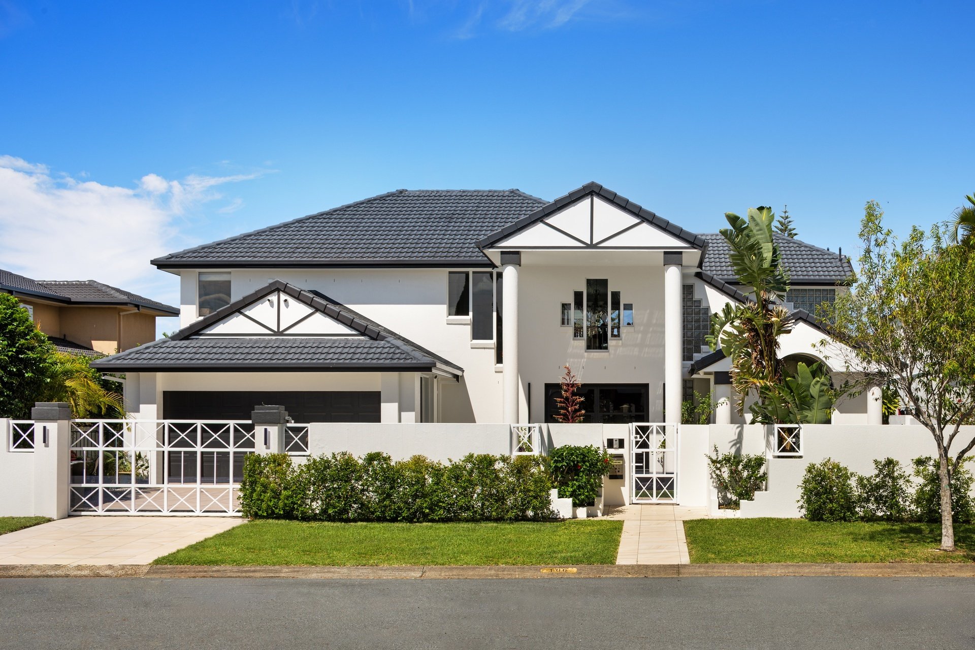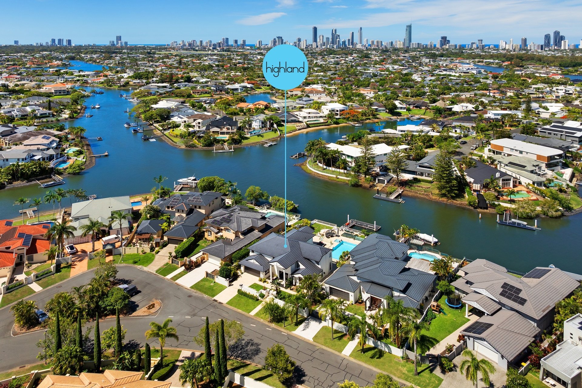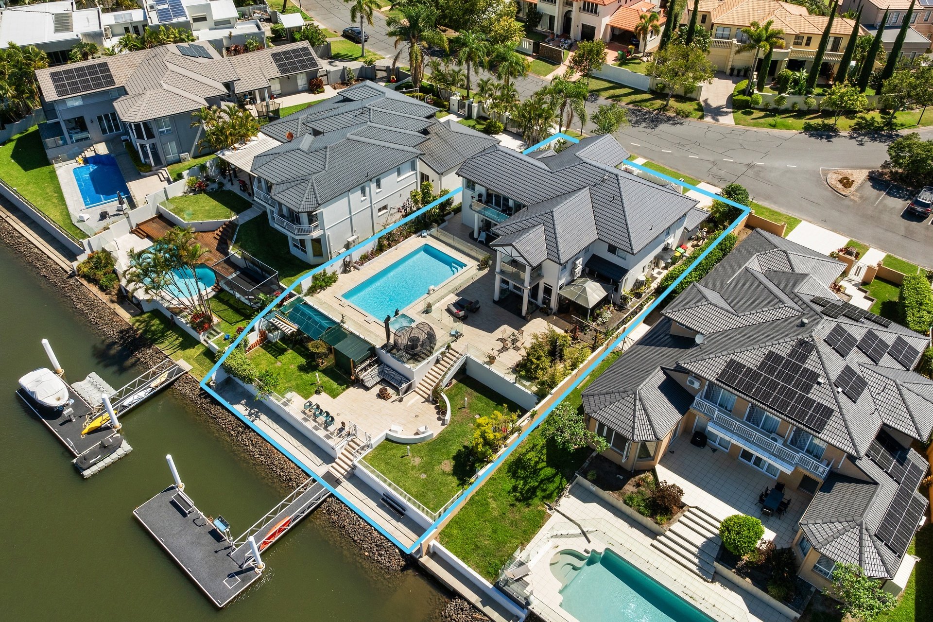 Welcome to a grand statement in family luxury, beautifully positioned in the heart of Benowa, just moments from the Main River. Perfectly tailored for modern living and effortless entertaining, this magnificent home offers space, style and serenity on an expansive 990sqm east-facing waterfront block. Set across two impressive levels, this residence captures the essence of Gold Coast living, with 22 metres of canal frontage, a magnesium pool and spa, and breathtaking Surfers Paradise skyline views that sparkle by day and glow by night. From watching fireworks over Broadbeach to relaxing poolside, every day here feels like a celebration. Step inside through a grand entryway with 17ft ceilings, unveiling an open and flowing floor plan designed for the whole family. The lower level offers a choice of multiple living zones, including formal and casual dining, a relaxed family lounge, and a stylish bar beside the kitchen, ideal for hosting and entertaining. Upstairs, a generous living area opens to a full-width balcony, framing those spectacular skyline and water views. The master suite is a true retreat, complete with a private balcony, walk-in robe, and a luxurious ensuite. Two of the additional bedrooms also enjoy its own ensuite and the fourth guest room downstairs has easy access to the fourth bathroom, offering privacy and comfort for all. Outdoors, expansive entertaining terraces spill onto a lush, fully fenced lawn, perfect for children and pets, leading down to your powered pontoon, ready for days on the water. With a greenhouse, vertical garden, and external LED feature lighting, every detail here has been thoughtfully considered.