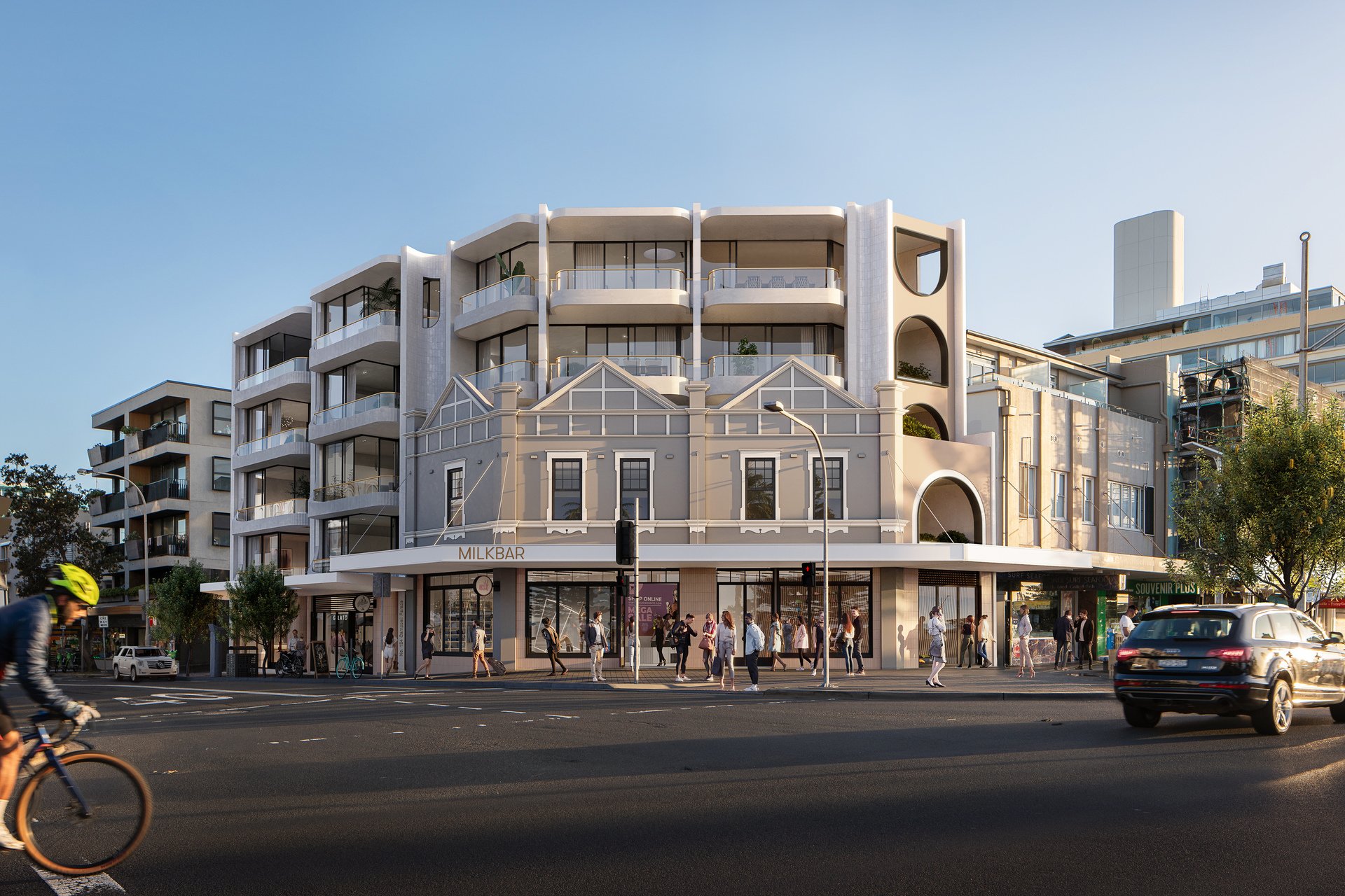 Nestled on a prominent corner overlooking the world-renowned Bondi Beach, the Hall and Campbell project is a testament to the fusion of heritage and contemporary design. This development not only capitalises on its prime location but also seamlessly integrates the historical significance of the site, preserving the iconic pitched gable once housing the Wentworth refreshment rooms and later Bates Milk Bar.