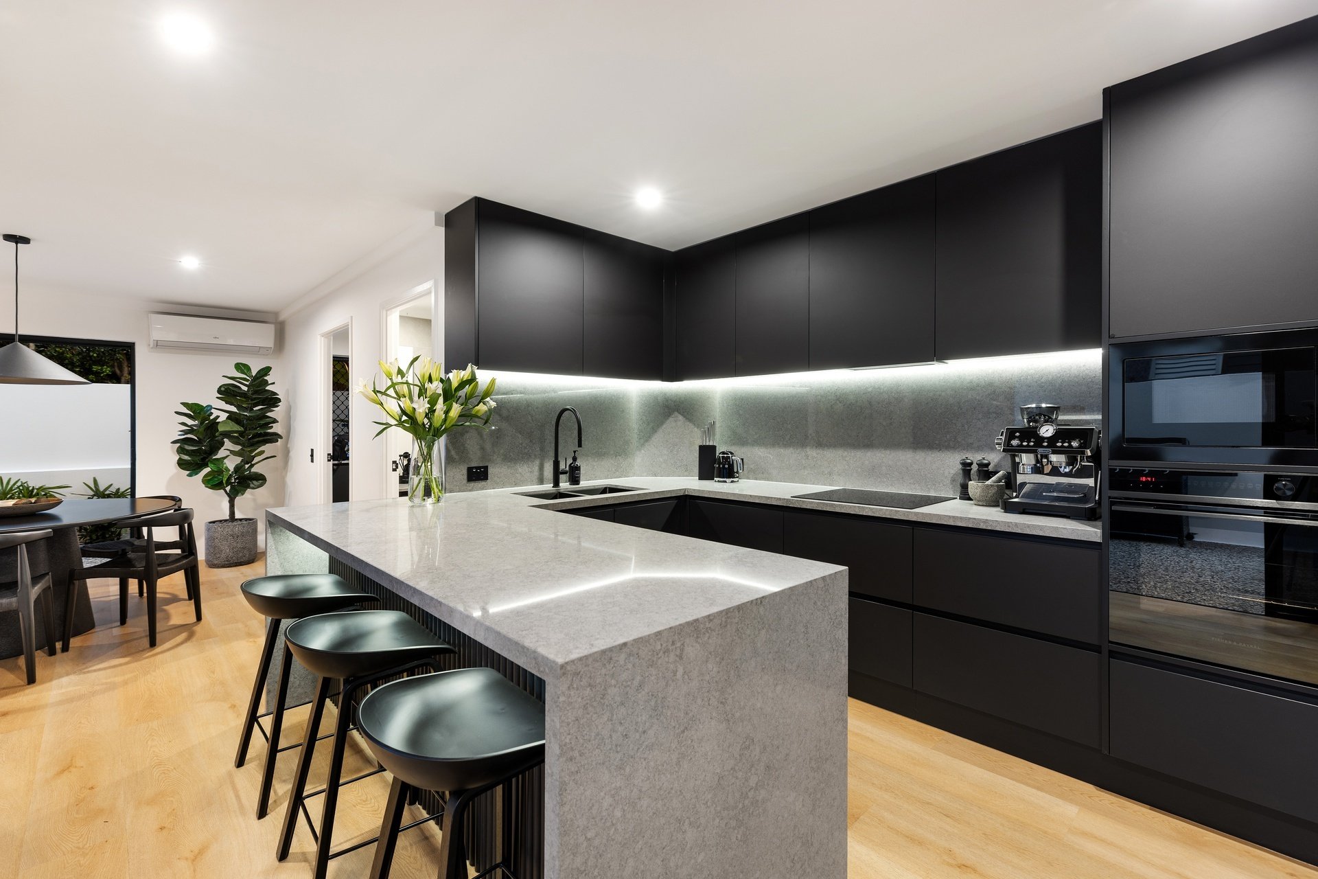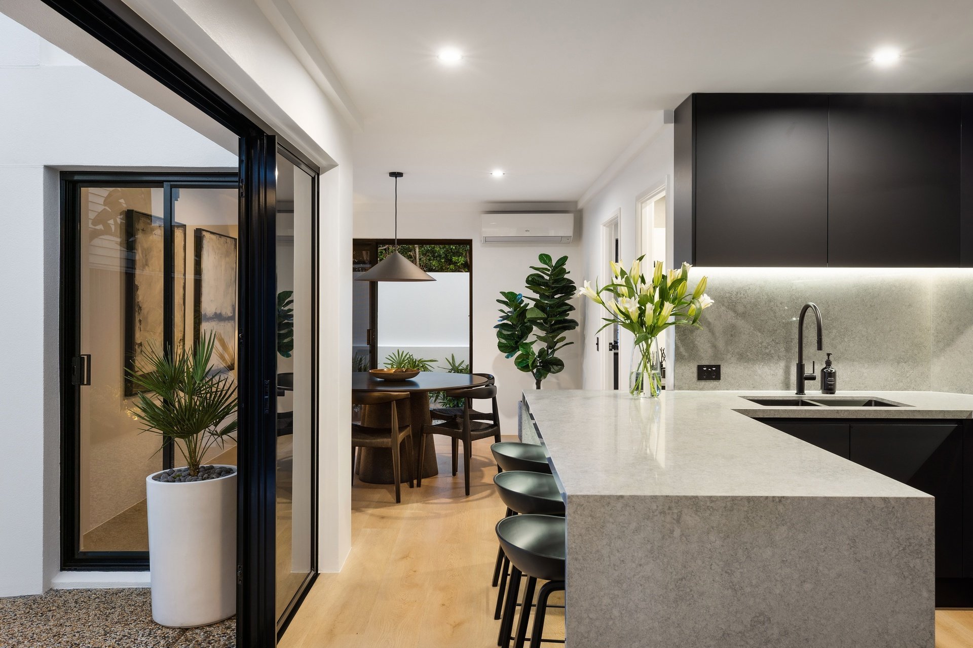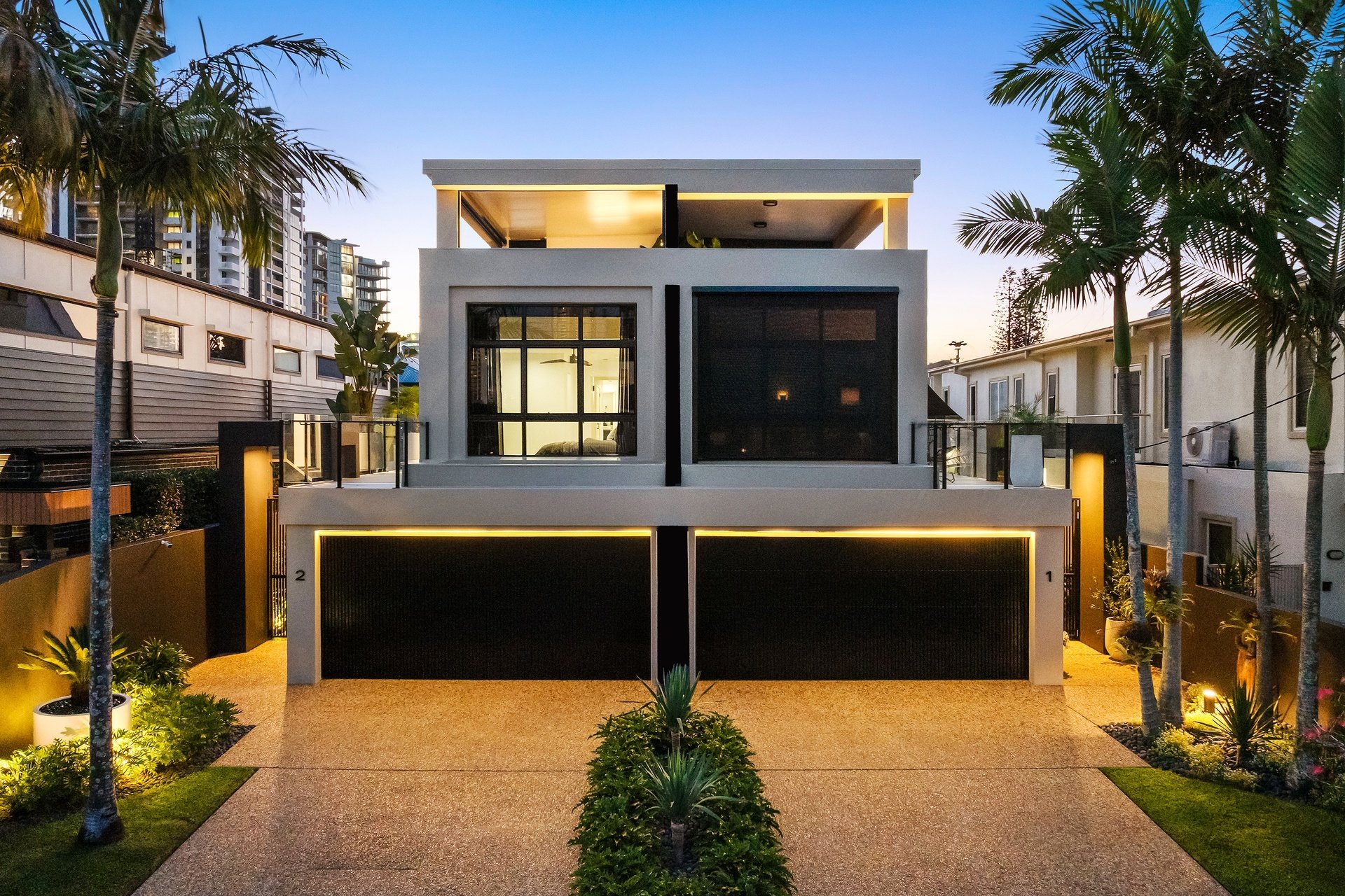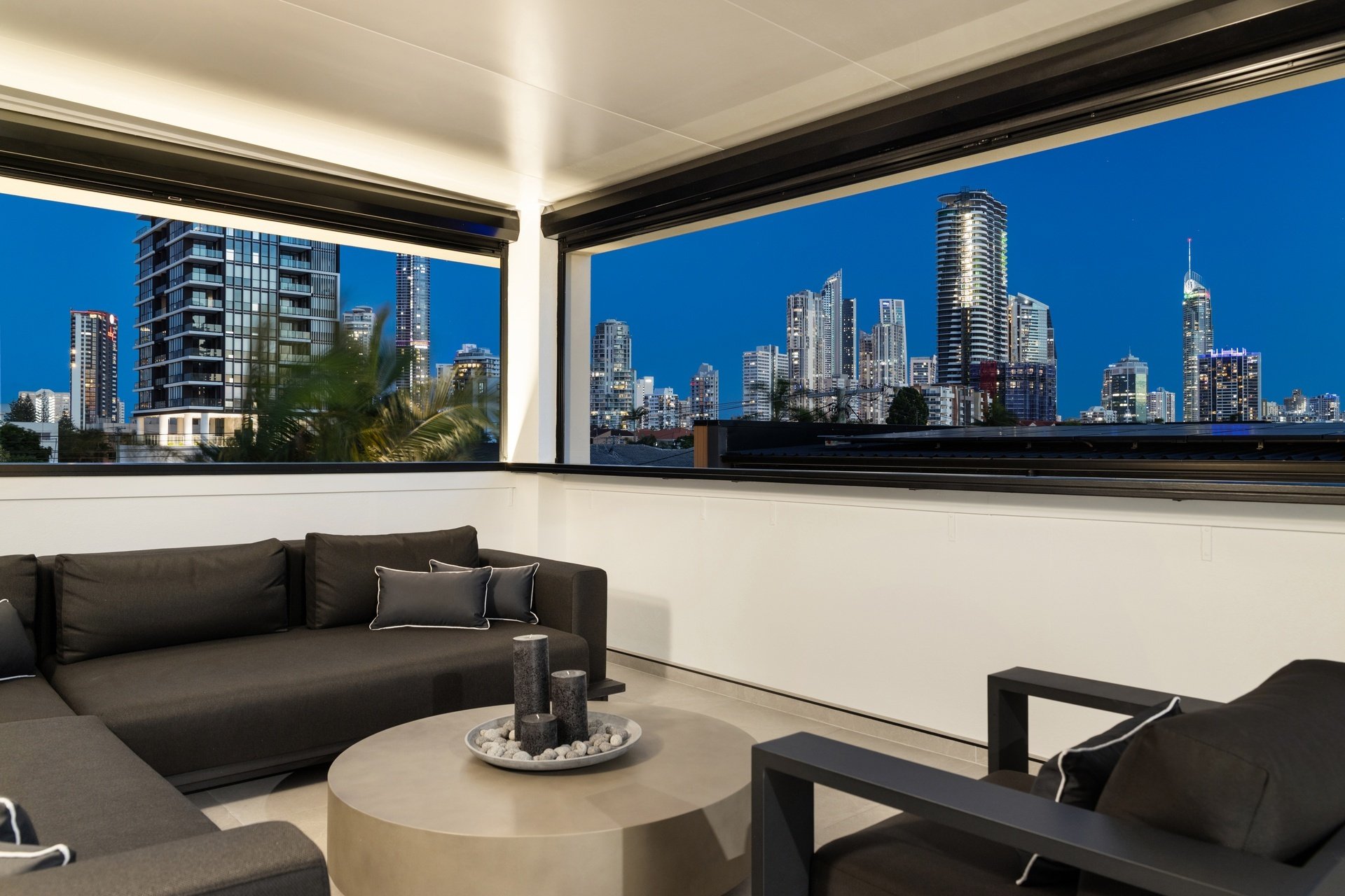Impeccably renovated to an elite standard, this tri-level villa delivers rare scale, sophistication and privacy within the Chevron Island lifestyle precinct. Spanning an expansive 332sqm, it offers house-like proportions with refined interiors showcasing polished natural hardwood floors, custom fingerprint-resistant matte black cabinetry, full Caesarstone finishes and abundant natural light via skylights and tinted glass. The open plan kitchen, living and dining zone forms the heart of the home, anchored by a striking designer kitchen with 40mm Caesarstone waterfall benchtops and premium European appliances, flowing seamlessly to a private courtyard. Crowning the residence, a showpiece roof terrace captures sweeping city skyline views and provides an exceptional setting for elevated entertaining, enhanced by ambient lighting and retractable privacy screening. A flexible lower-level multipurpose zone adds versatility as a home office, media room or guest retreat. Three oversized bedrooms include an opulent master with walk-through robe and luxe ensuite, while secure garaging for two vehicles completes this exceptional, low-maintenance residence. Positioned within the tightly held Chevron Island enclave, this address places beaches, cafés, boutique dining and village shopping within walking distance, with HOTA, Surfers Paradise and major transport links just minutes away.