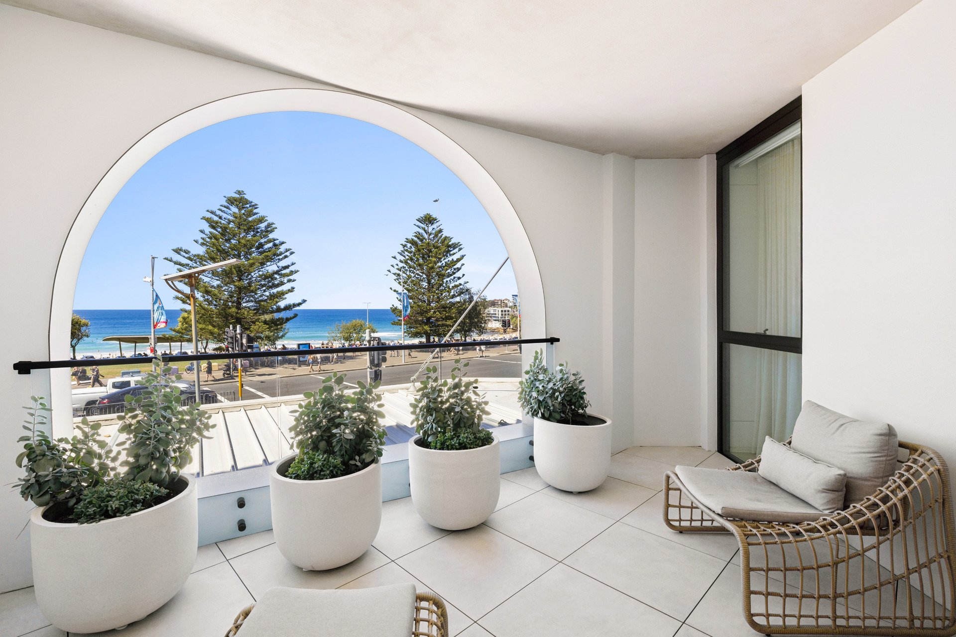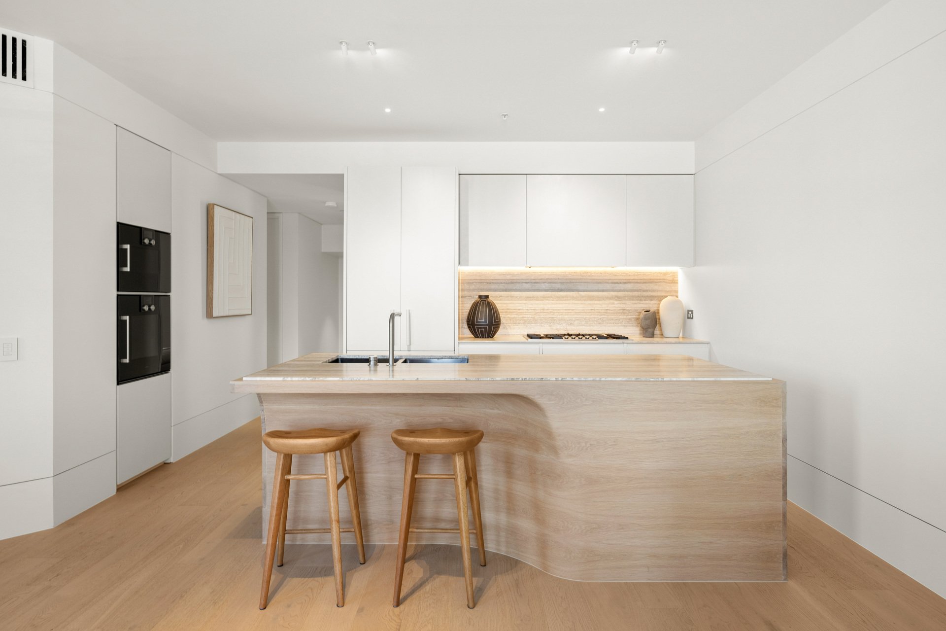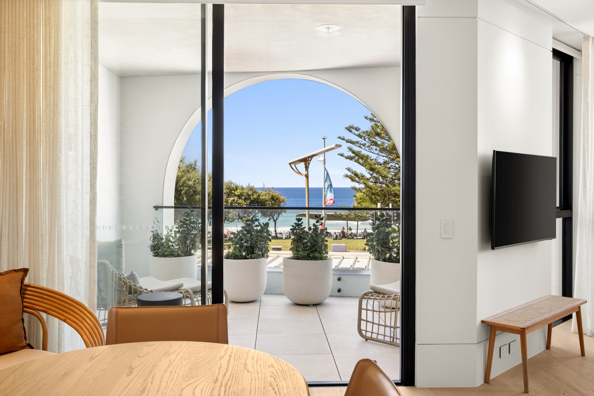 The architectural forms draw inspiration from the graceful curves of seashells, capturing the essence of coastal living with interiors by Richards Stanisich that carefully curated colour palette that mirrors the Bondi context, with coastal tones and a touch of pastels, harmoniously blending with the surroundings. This thoughtful integration enhances the overall aesthetic, creating a visual narrative that resonates with the beachside locale.