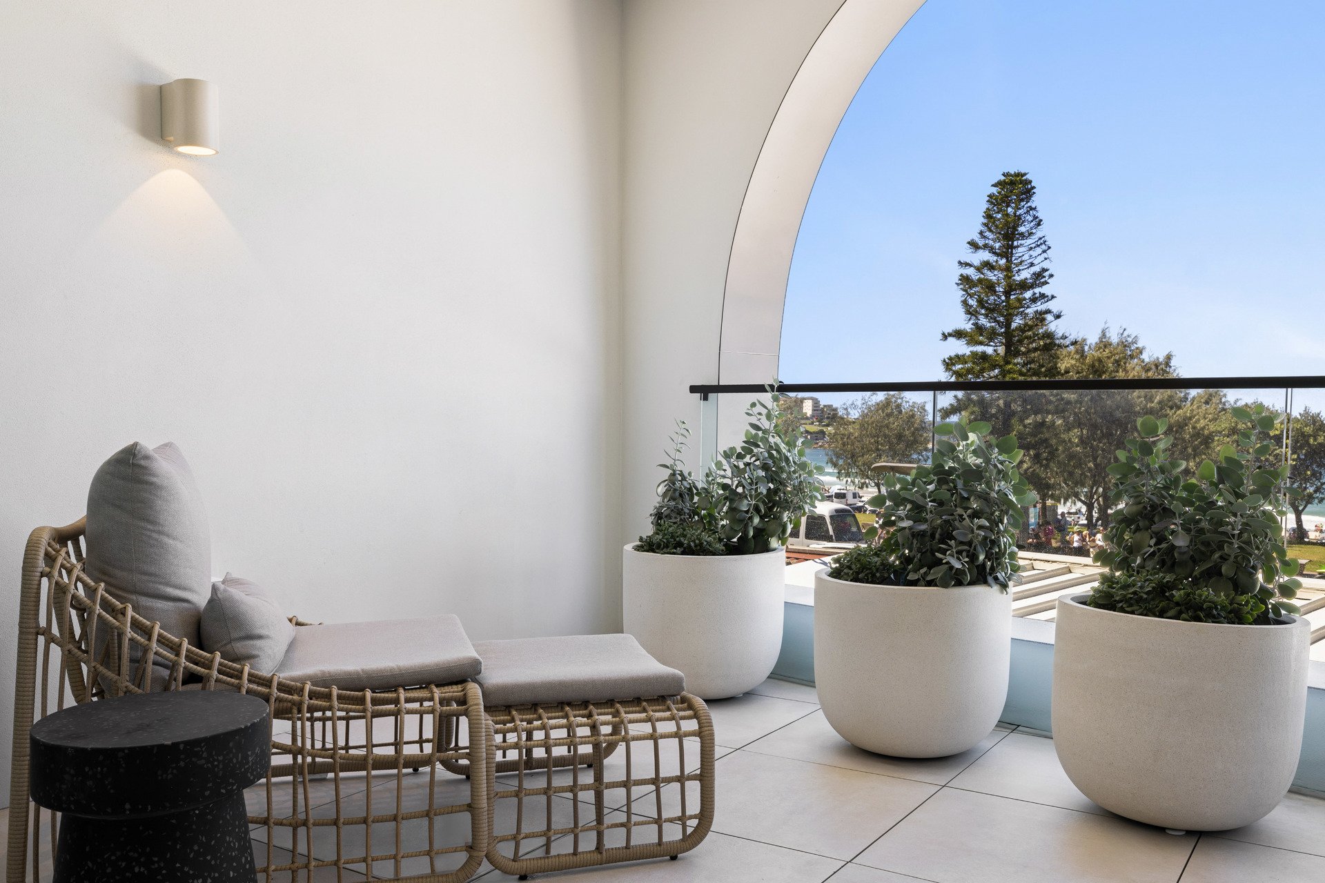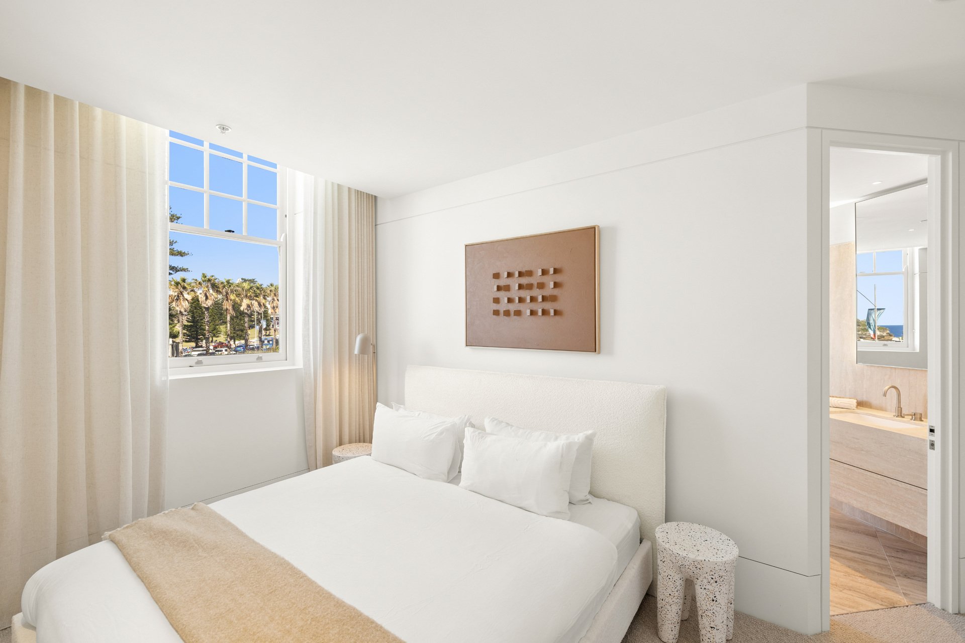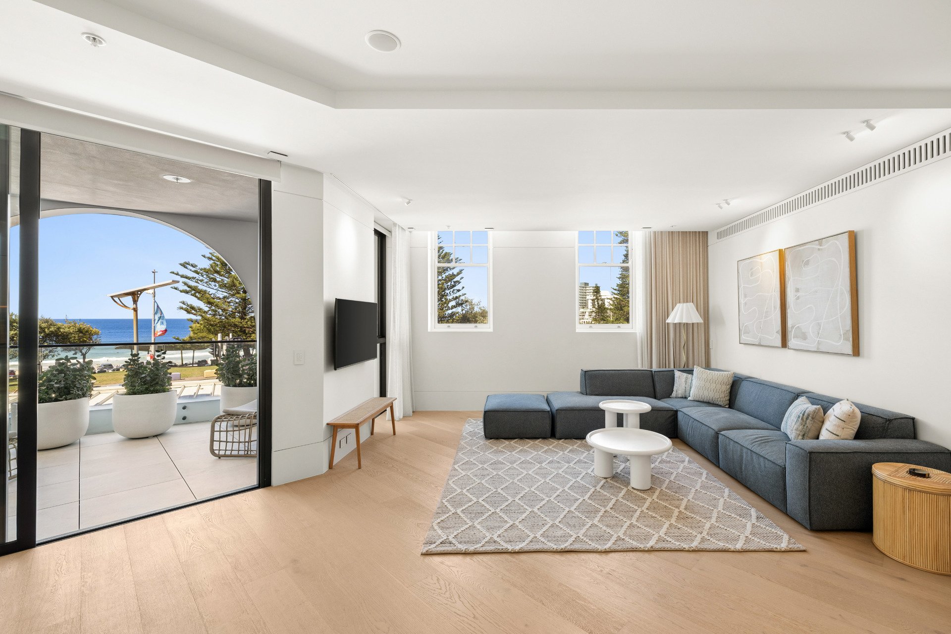 The architectural forms draw inspiration from the graceful curves of seashells, capturing the essence of coastal living with interiors by Richards Stanisich that carefully curated colour palette that mirrors the Bondi context, with coastal tones and a touch of pastels, harmoniously blending with the surroundings. This thoughtful integration enhances the overall aesthetic, creating a visual narrative that resonates with the beachside locale.