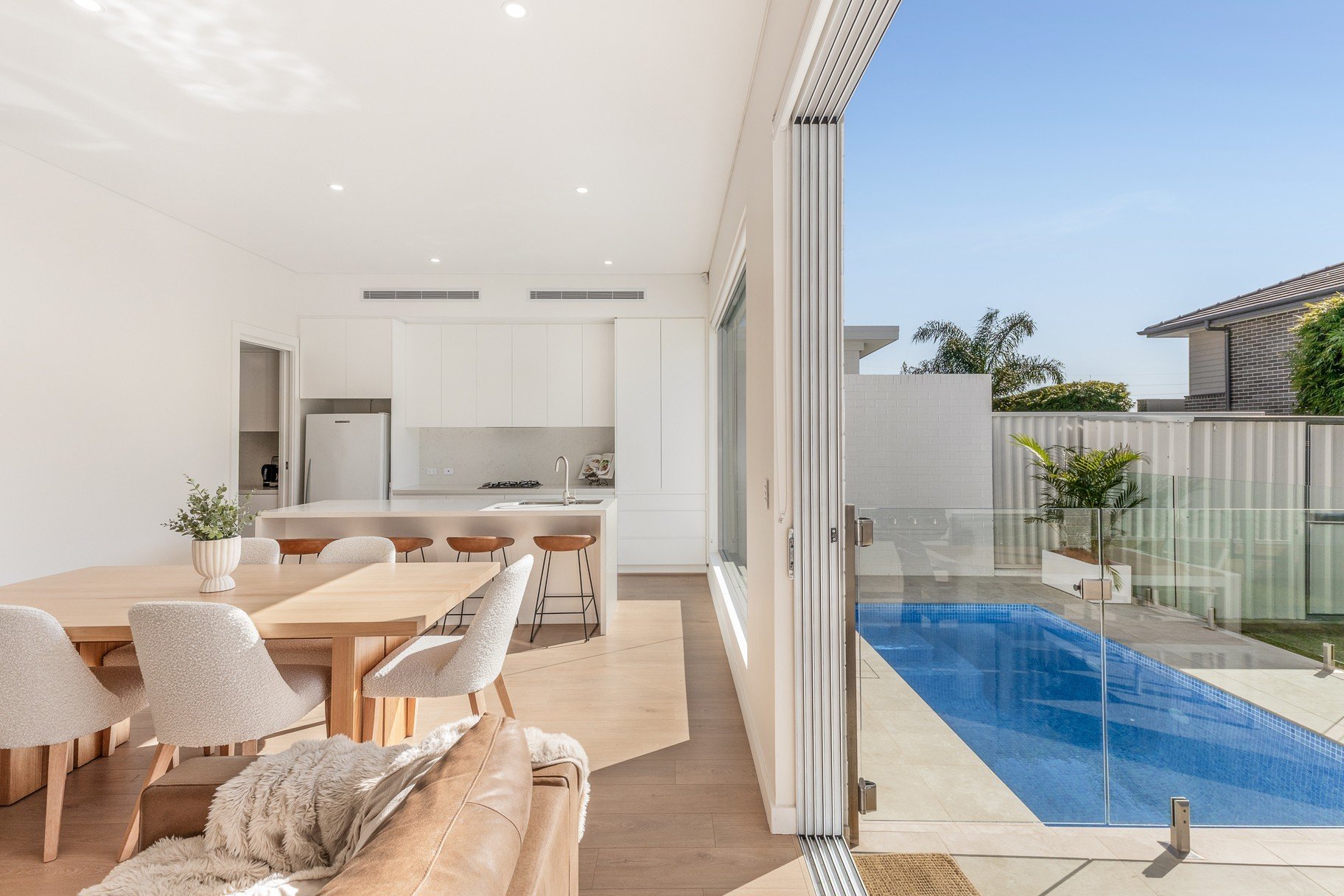 Discover the epitome of coastal luxury in this stunning residence, where modern design and timeless sophistication come together effortlessly. Generous open-plan interiors flow seamlessly to a covered outdoor entertaining area, overlooking beautifully landscaped gardens and a sparkling inground swimming pool, creating your own private retreat. Sleek finishes, soaring ceilings, and engineered timber floors enhance the light-filled interiors, striking the perfect harmony between warmth and elegance. Positioned in the exclusive and highly desirable suburb of Woolooware, this home promises a lifestyle of low-maintenance coastal living, offering style, comfort, and convenience at every turn.
