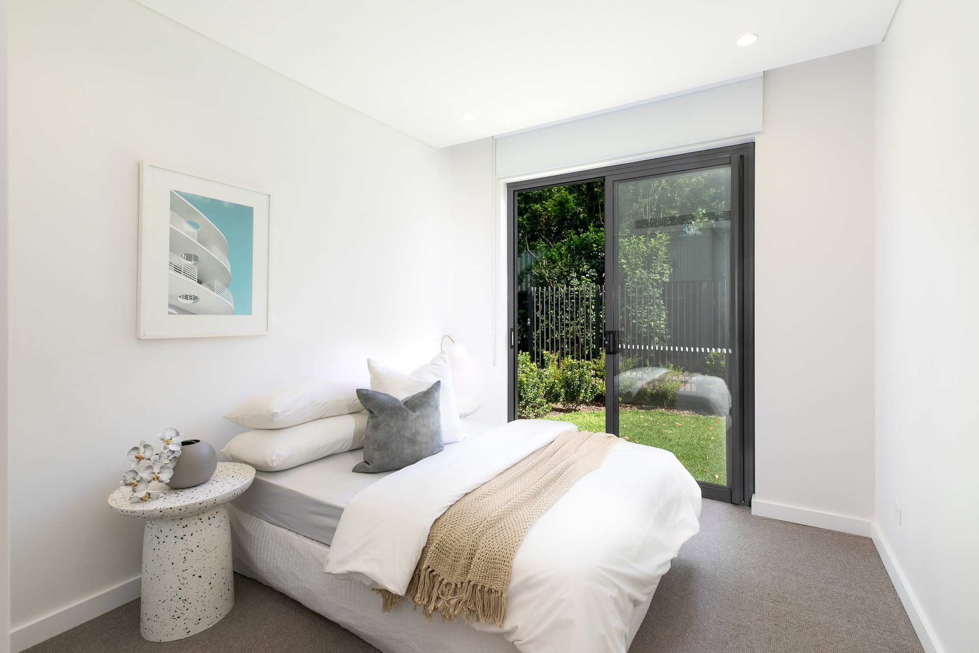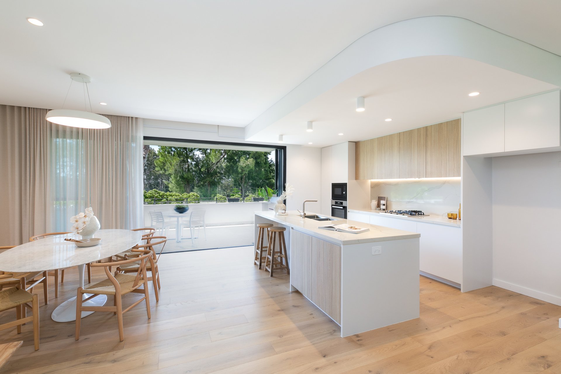 The light-filled living and dining area flows seamlessly to a north-facing balcony, creating an inviting space to relax or entertain.