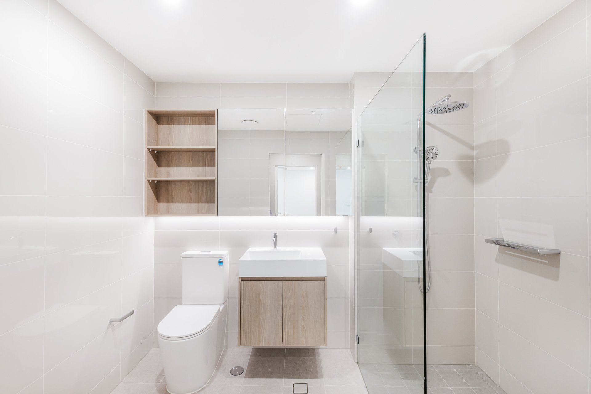 • ‐ Sleek bathroom emboldened by integrated stone and timber vanity, and Parisi fixtures