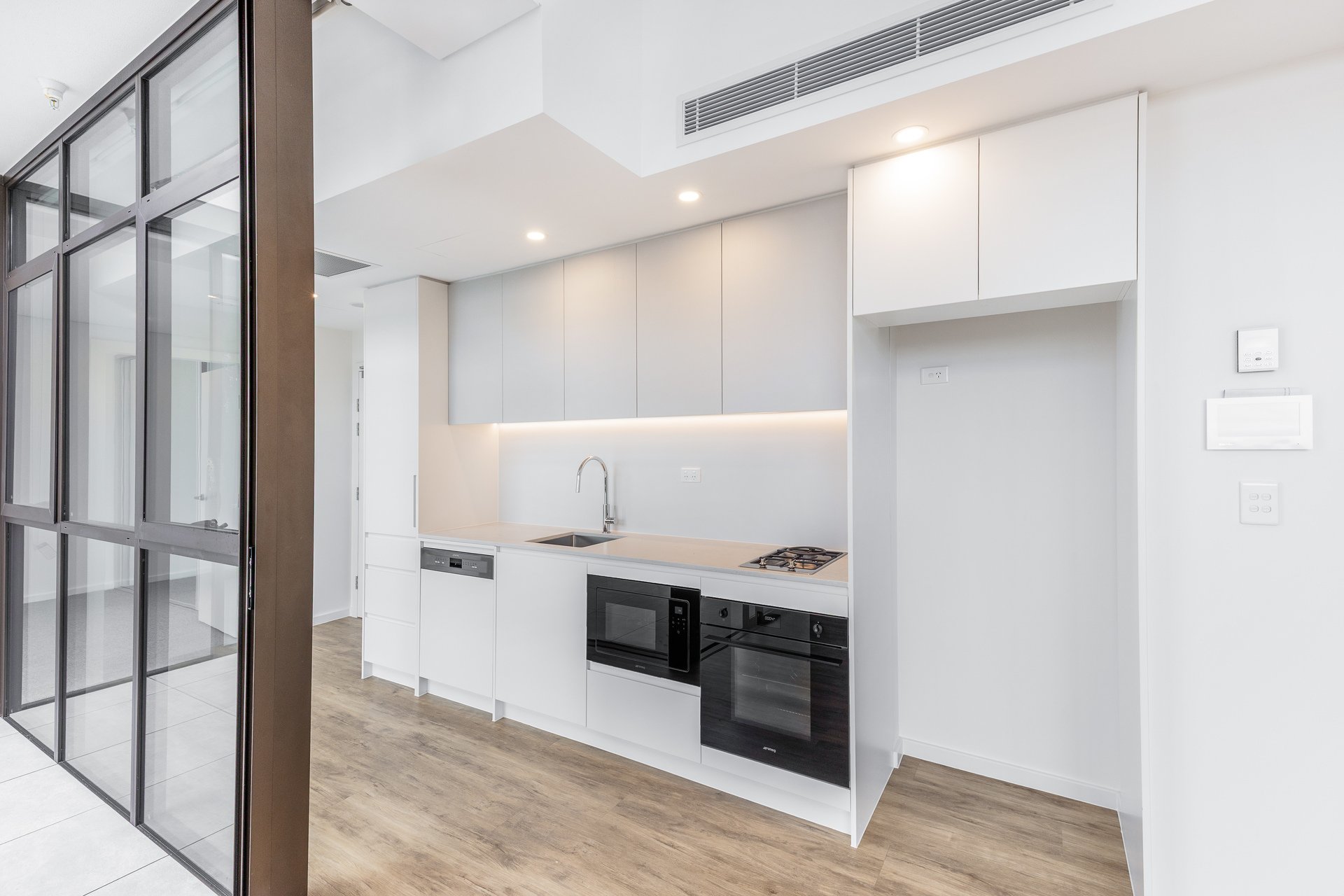 • ‐ Gourmet kitchen boasts Cloudburst Concrete Caesarstone benches and integrated Smeg appliances