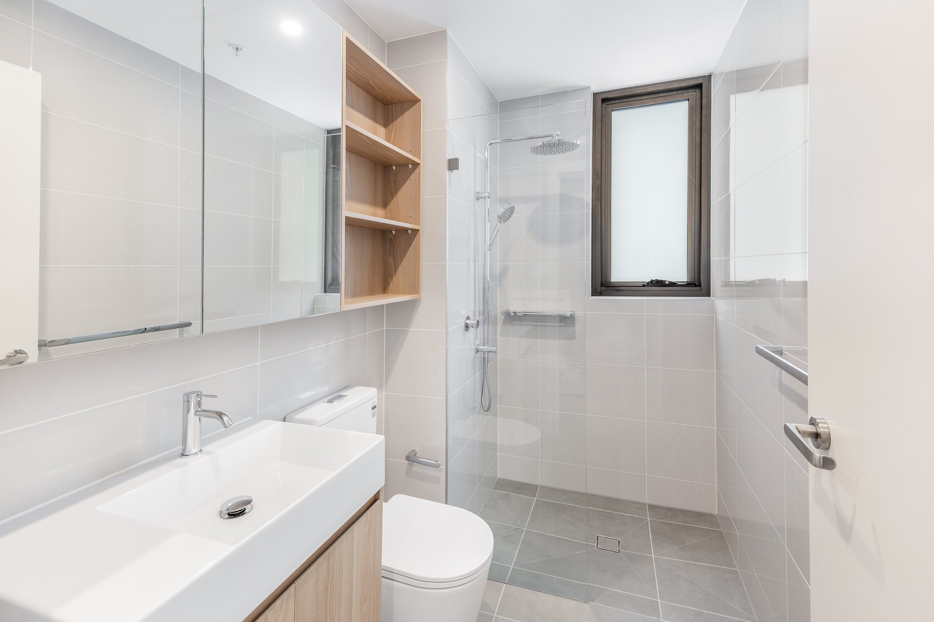 • ‐ Sleek bathroom emboldened by integrated stone and timber vanity, and Parisi fixtures