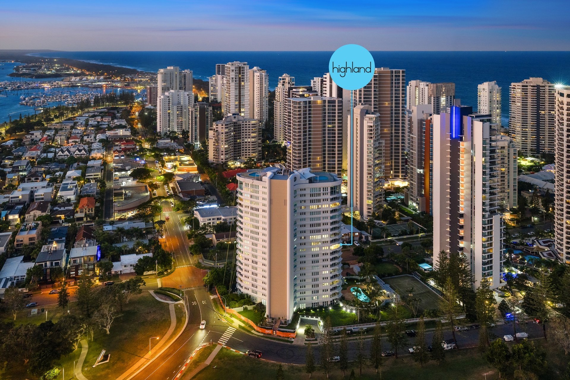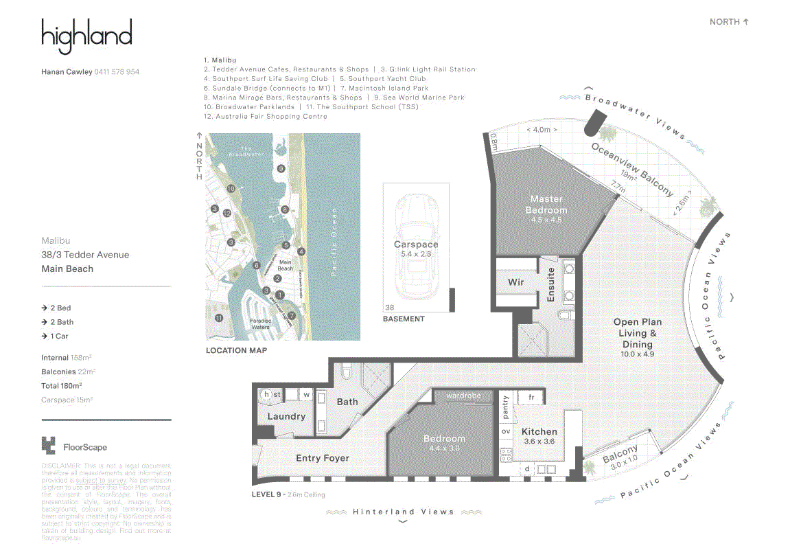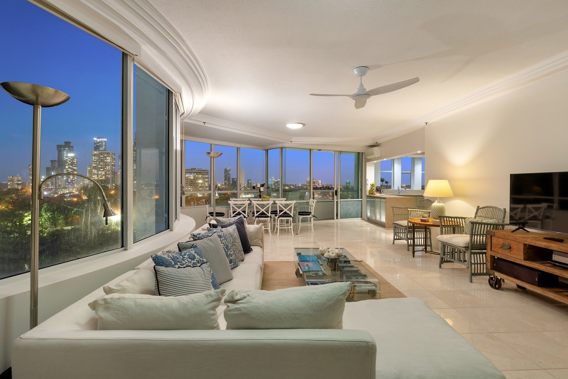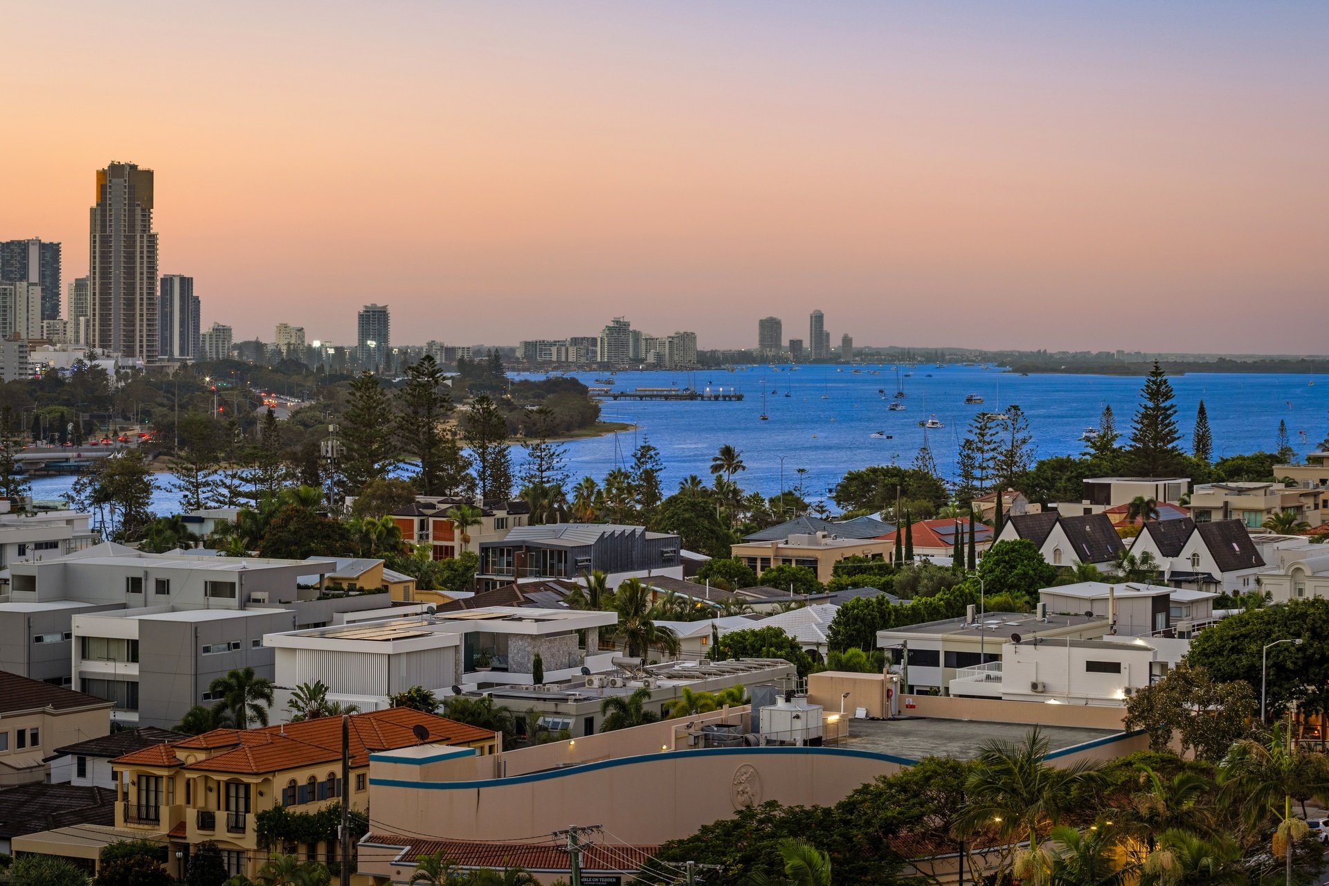 Positioned high above Main Beach, this light-filled apartment captures sweeping views across the ocean, Broadwater and glittering city skyline. Designed for effortless living, the expansive open plan layout is framed by floor-to-ceiling glass, drawing the outlook into every corner of the home. Centrally positioned, the well-appointed kitchen offers generous bench space and functionality, while open plan living and dining zones flow effortlessly to a covered balcony, perfect for entertaining or relaxed evenings. Two spacious bedrooms and two bathrooms complete the layout, including a master suite with ensuite, all set within a resort-style complex just moments from Tedder Avenue's vibrant dining scene.