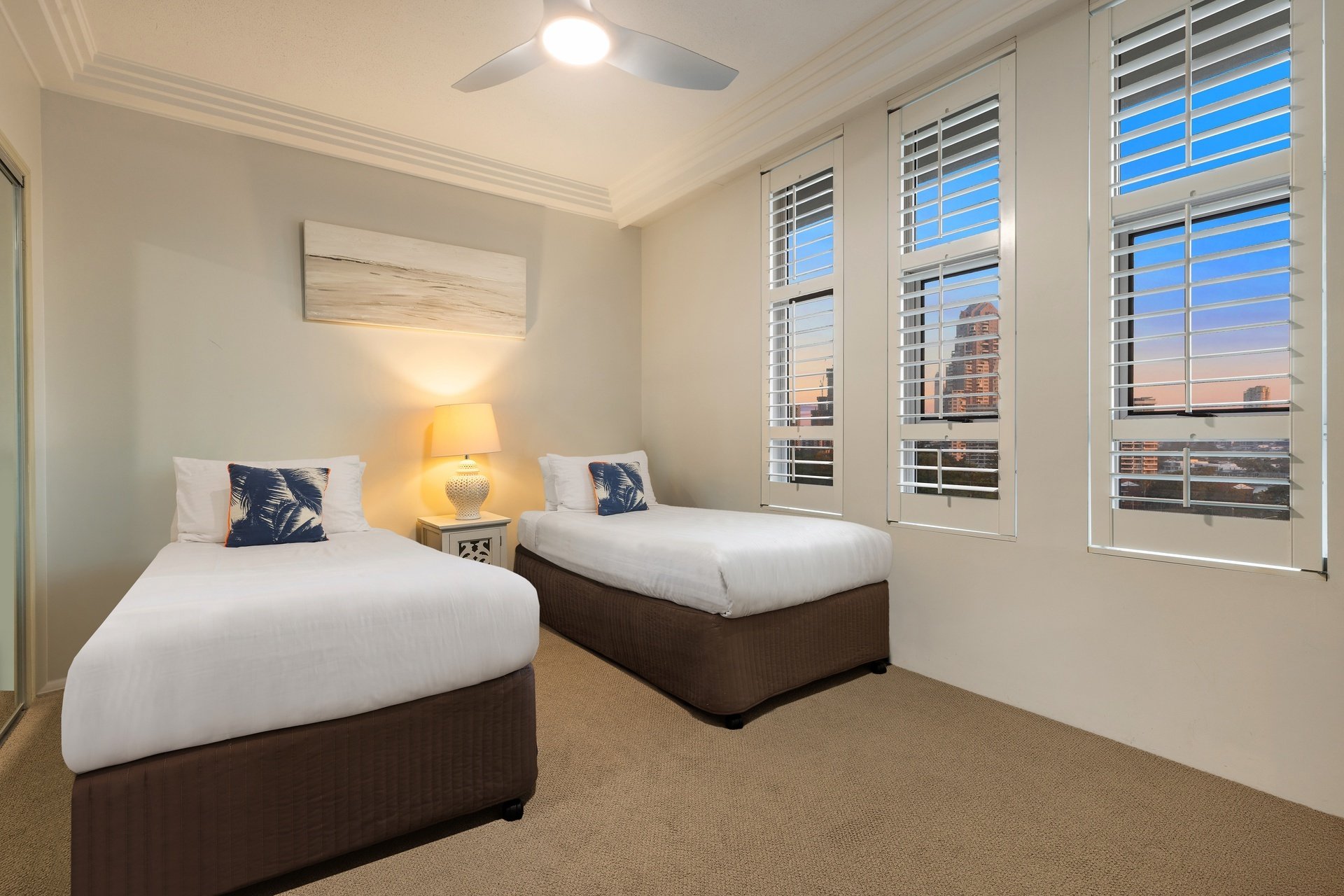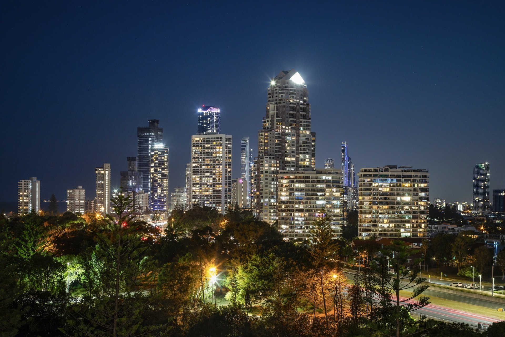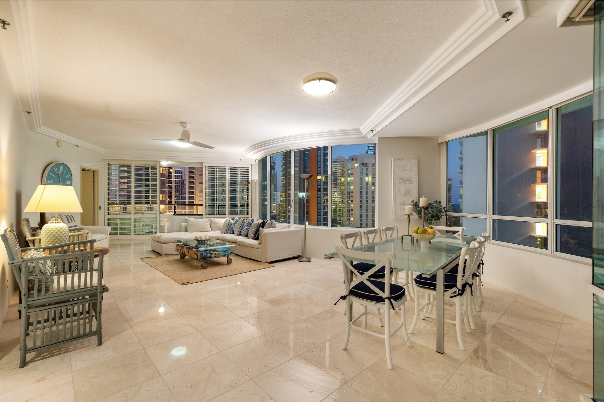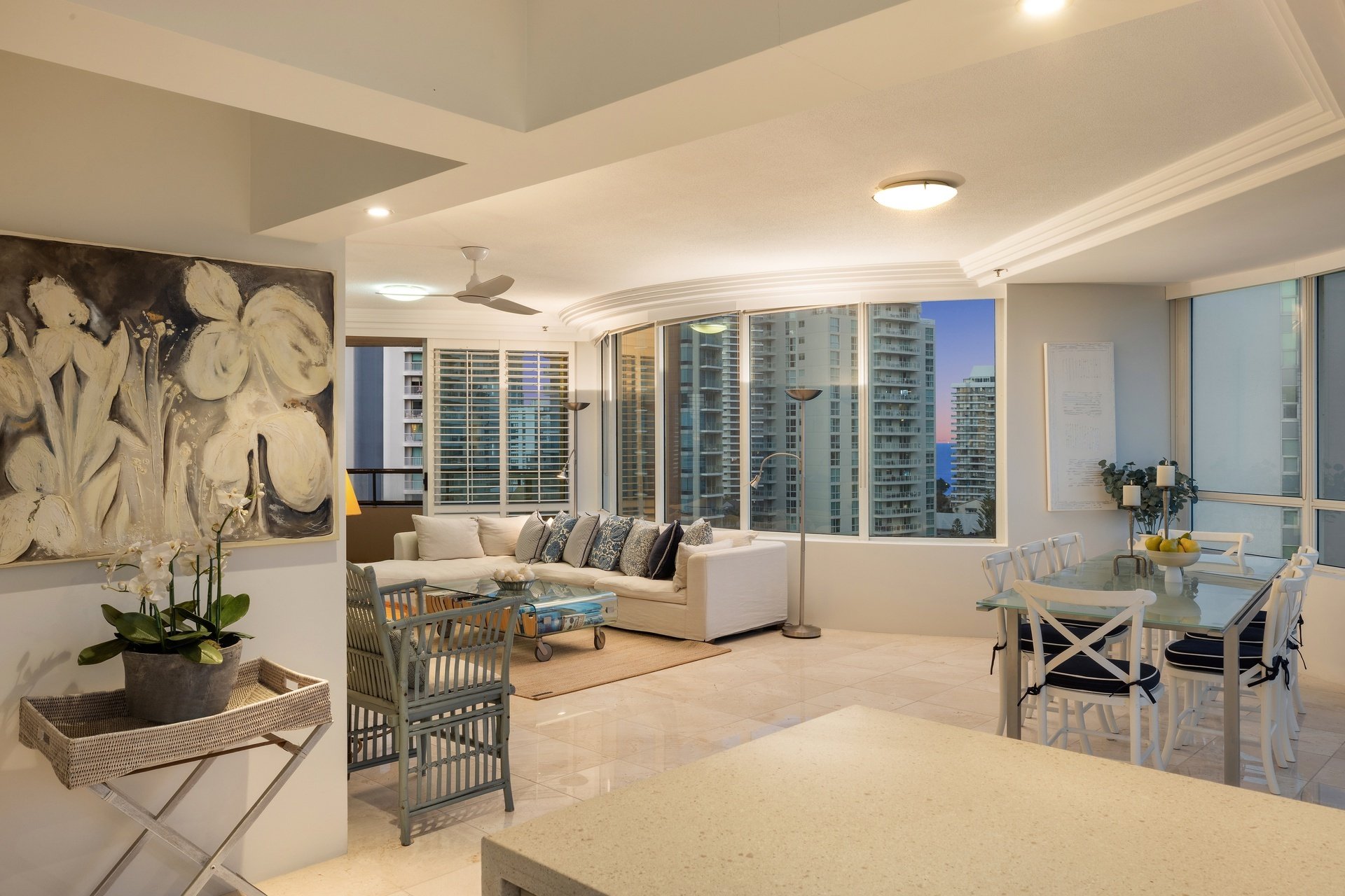 Positioned high above Main Beach, this light-filled apartment captures sweeping views across the ocean, Broadwater and glittering city skyline. Designed for effortless living, the expansive open plan layout is framed by floor-to-ceiling glass, drawing the outlook into every corner of the home. Centrally positioned, the well-appointed kitchen offers generous bench space and functionality, while open plan living and dining zones flow effortlessly to a covered balcony, perfect for entertaining or relaxed evenings. Two spacious bedrooms and two bathrooms complete the layout, including a master suite with ensuite, all set within a resort-style complex just moments from Tedder Avenue's vibrant dining scene.