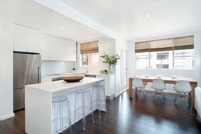 A sleek interior renovation has transformed this first floor beachside home into a stylish retreat set within strolling distance to the Esplanade and vibrant array of Cronulla café's. Timber flooring flows throughout the open plan living space, while the stunning kitchen with stone bench tops creates a focal point as you walk through the door.